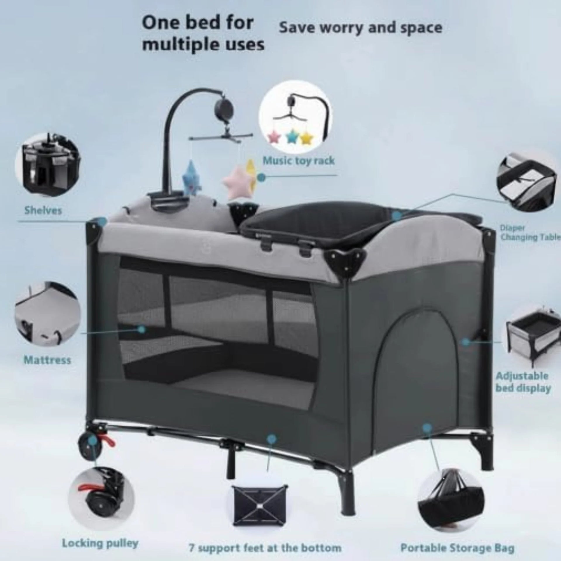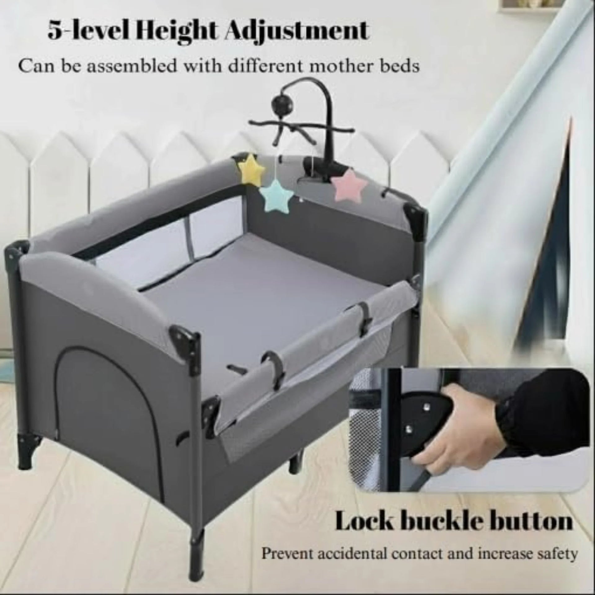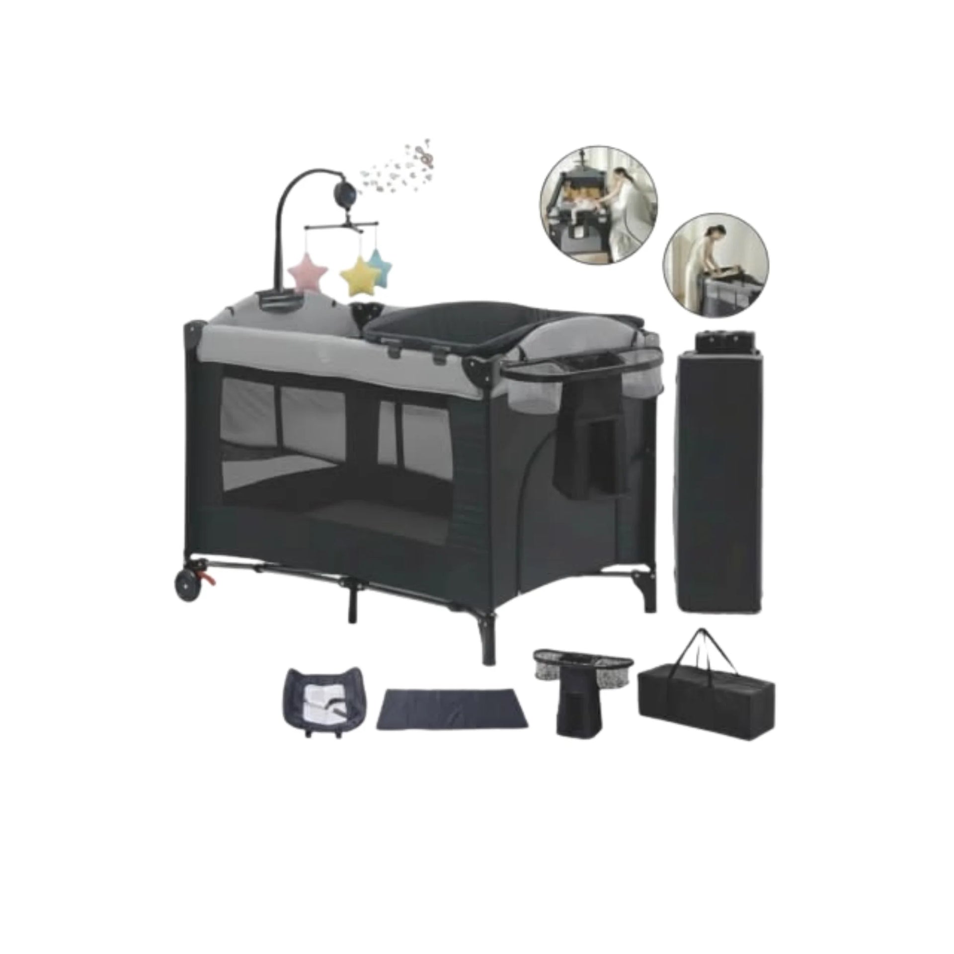 PICCASIOโ„ข 5 in 1 Baby Crib โ€“ Foldable Travel Bassinet Playard with Changing Table, Music Box, Mosquito Net, and Lockable Wheels โ€“ Multifunctional Bedside Sleeper for Infants & Children